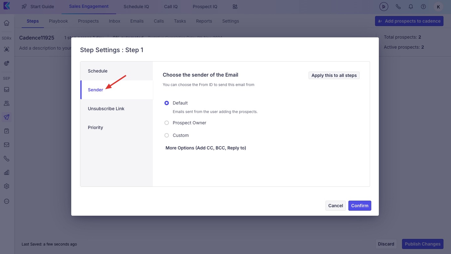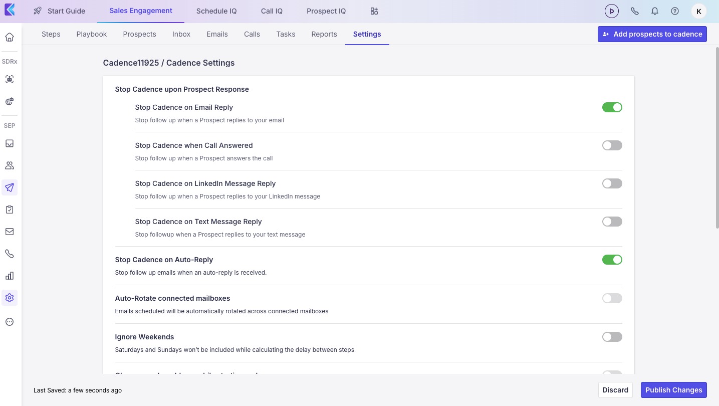 Stop Cadence on Reply – enabled by default; this option ensures no further follow-up emails are sent to a prospect that replies to you.