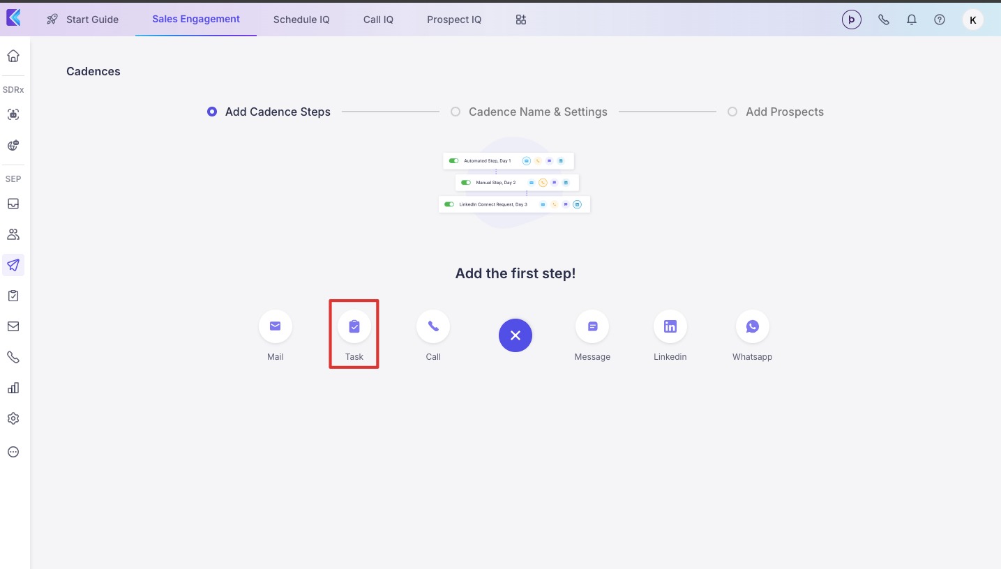 To begin, go to Cadences > Create Cadence. You can choose a step to be an Email, a Call, or a Task.