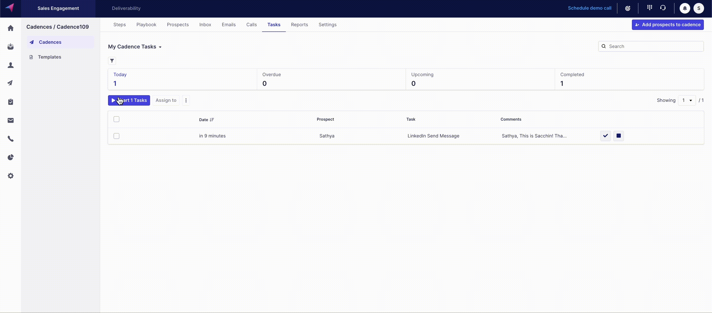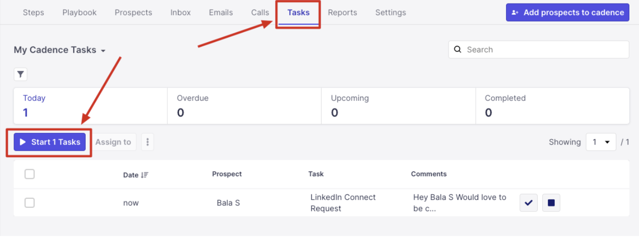 Once you've created your LinkedIn tasks, you can view the tasks from the Tasks tab on the cadence navigation bar. Click on the Start Tasks button to begin completing the tasks.