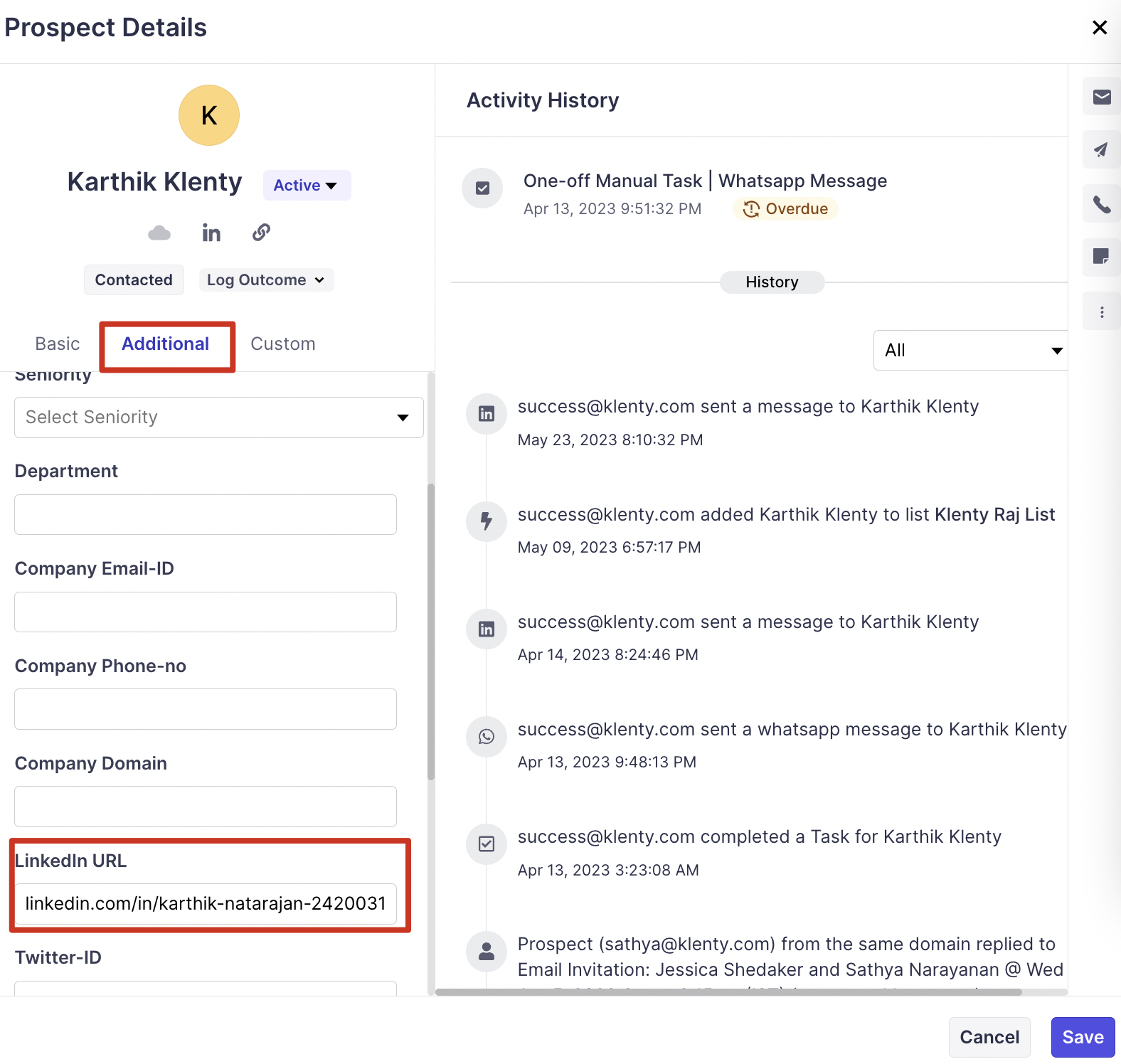 As a prerequisite, please make sure that you have uploaded prospects along with their LinkedIn URL, in the prospect details, as shown below: