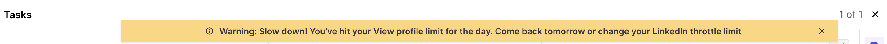 You will be prompted with an error banner at the top of the page when the limit for tasks such as any of the View Profile, Connect Request, Send Inmail, and Send messages has been exceeded. This ensures that the execution of LinkedIn tasks remains consistent and cohesive.