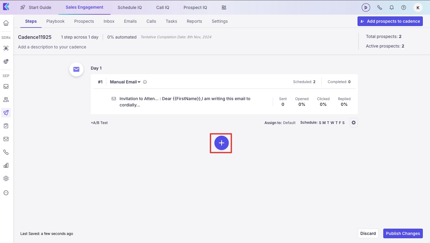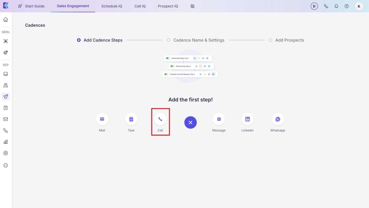 Click on the + button to the left to ‘Add New step’ to add another step in your cadence