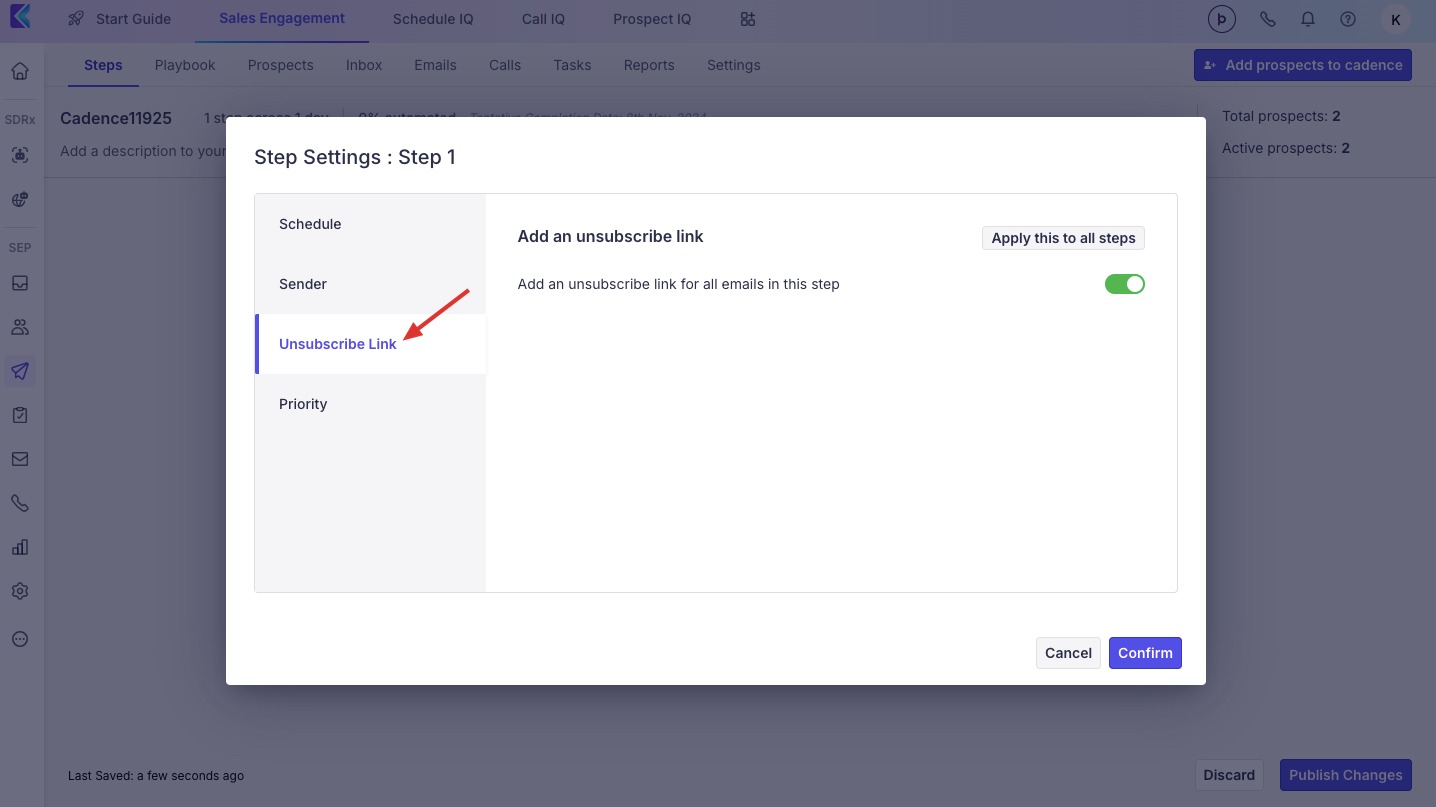 Stop Cadence on Reply – enabled by default; this option ensures no further follow-up emails are sent to a prospect that replies to you.