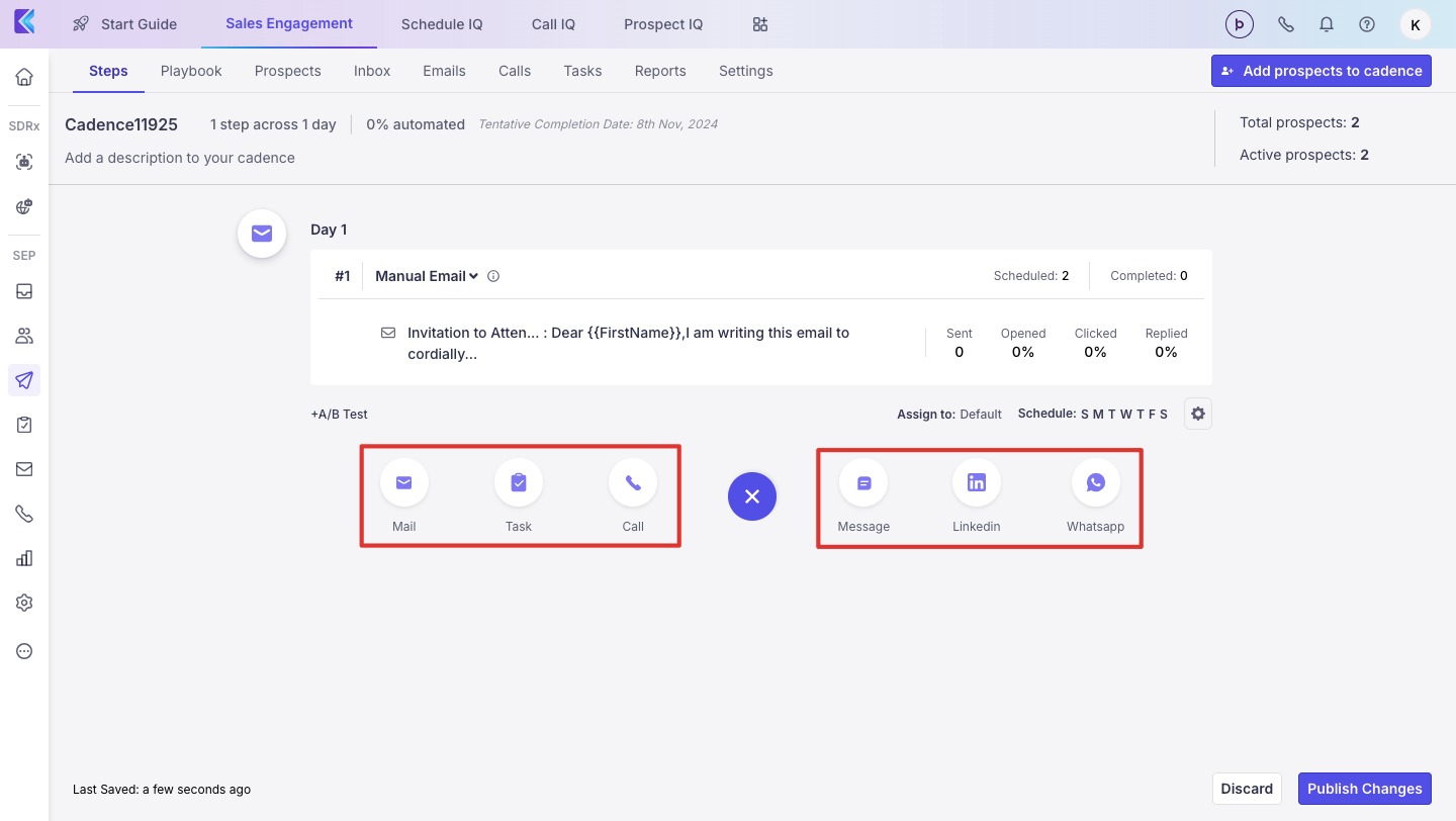 To begin, go to Cadences > Create Cadence. You can choose a step to be an Email, a Call, or a Task.
