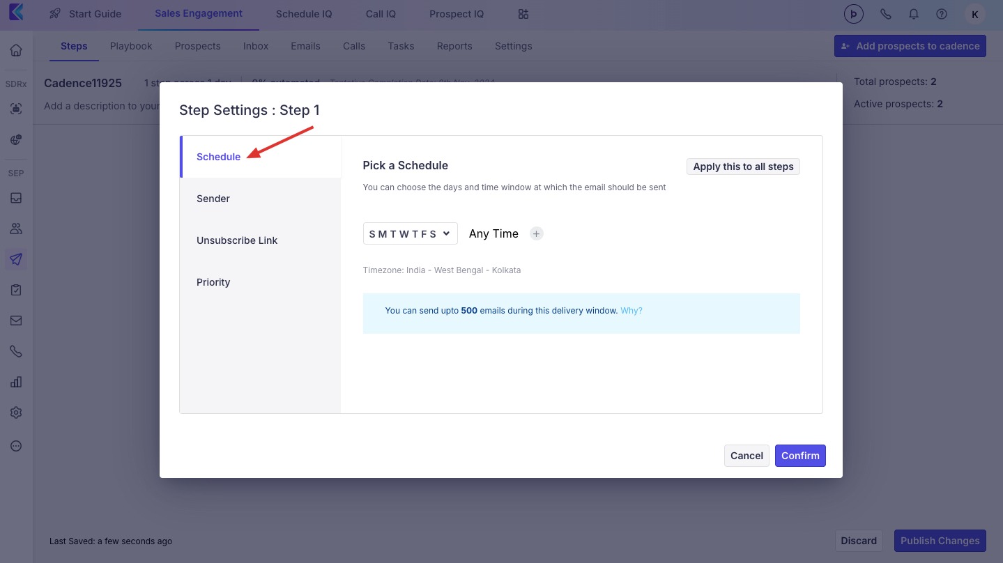 Schedule - You can choose the days that the emails will be sent on and unselect the days you'd like to skip. Additionally, you can schedule the time Klenty must send the emails in that step. We will reschedule any emails pending at the end of the window to the next day.