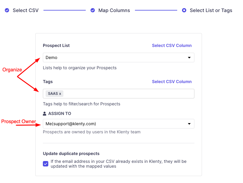 6. Enable Update Duplicates if you need to update prospects already added to your Klenty account.