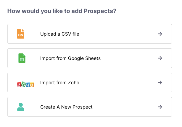 2. Select ‘Upload a CSV file’ to import your CSV file (You can also import via Google Sheets or directly from your CRM)