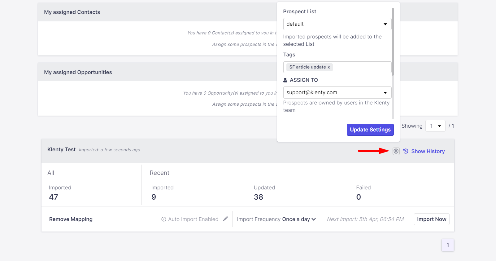 If you want to make changes to the future imports from the same List or report that was imported before, you can choose the settings option next to the Imported List.