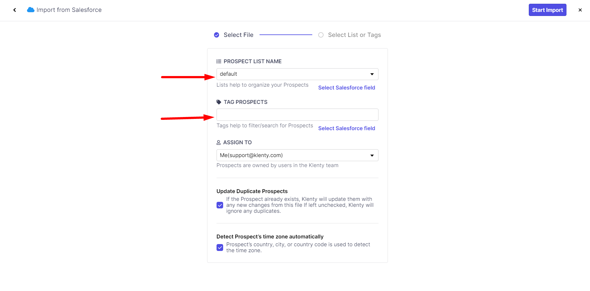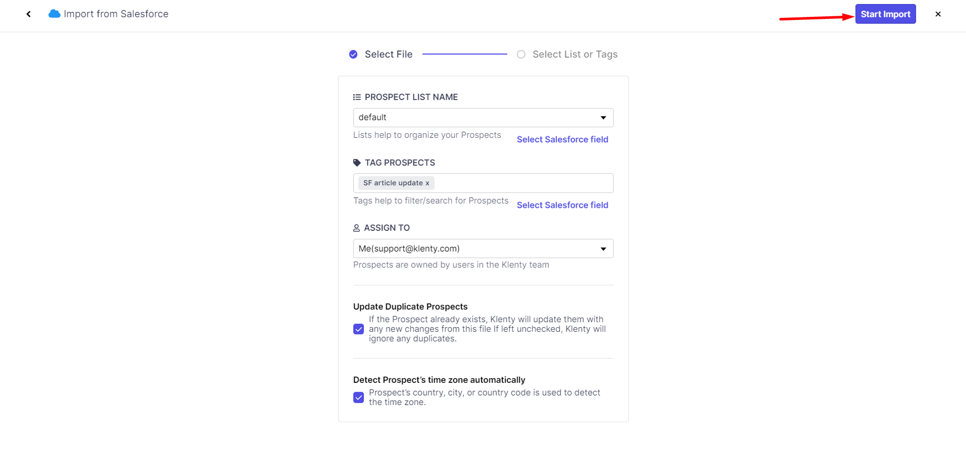 5. When these are set, you can hit "Start Import" to start importing the required prospects to Klenty.