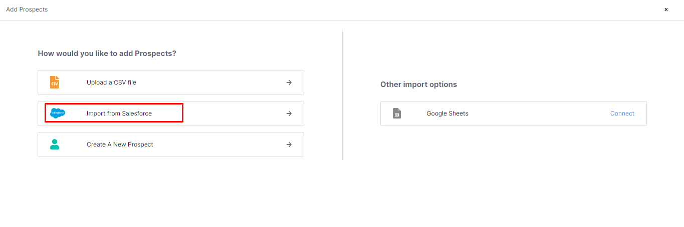 In your Klenty account and go to Prospects -> click on the Add Prospects icon at the top right -> select Salesforce.