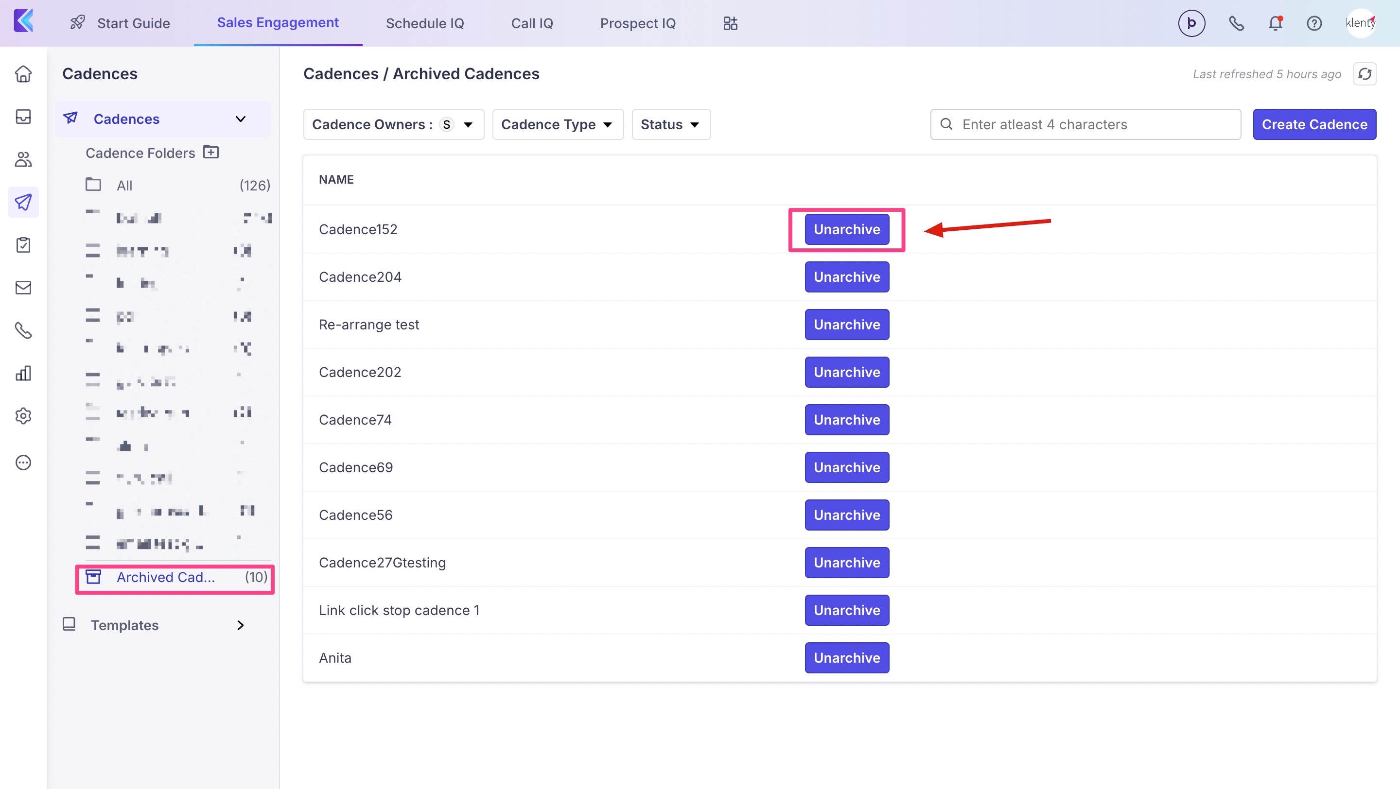 You will now see a list of cadences that you have archived. Click on Unarchive to restore the cadence.
