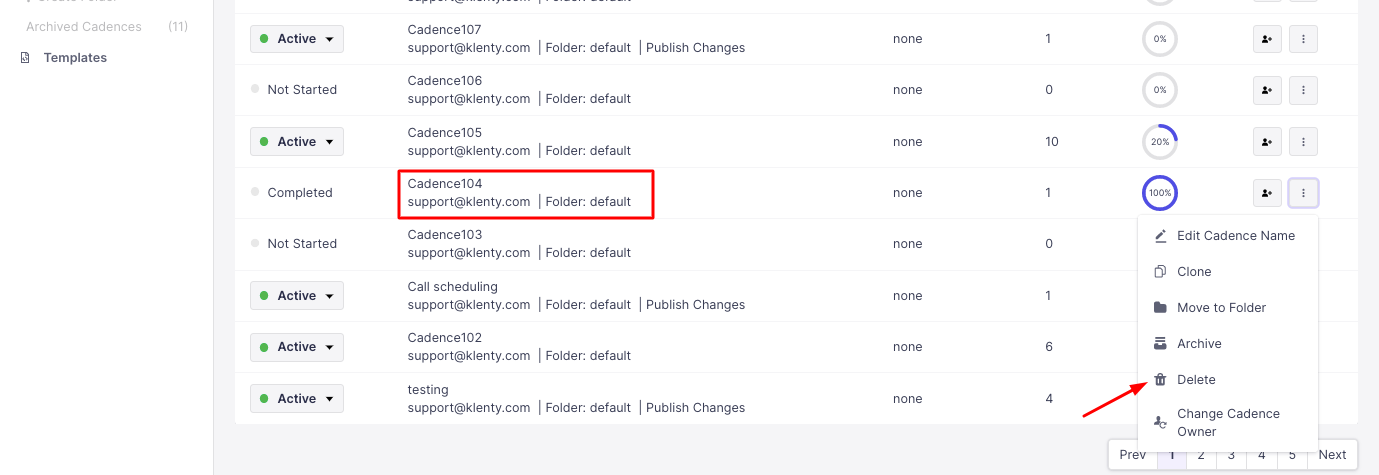 Click on the three dots to the right of the cadence you wish to delete and select the Delete option