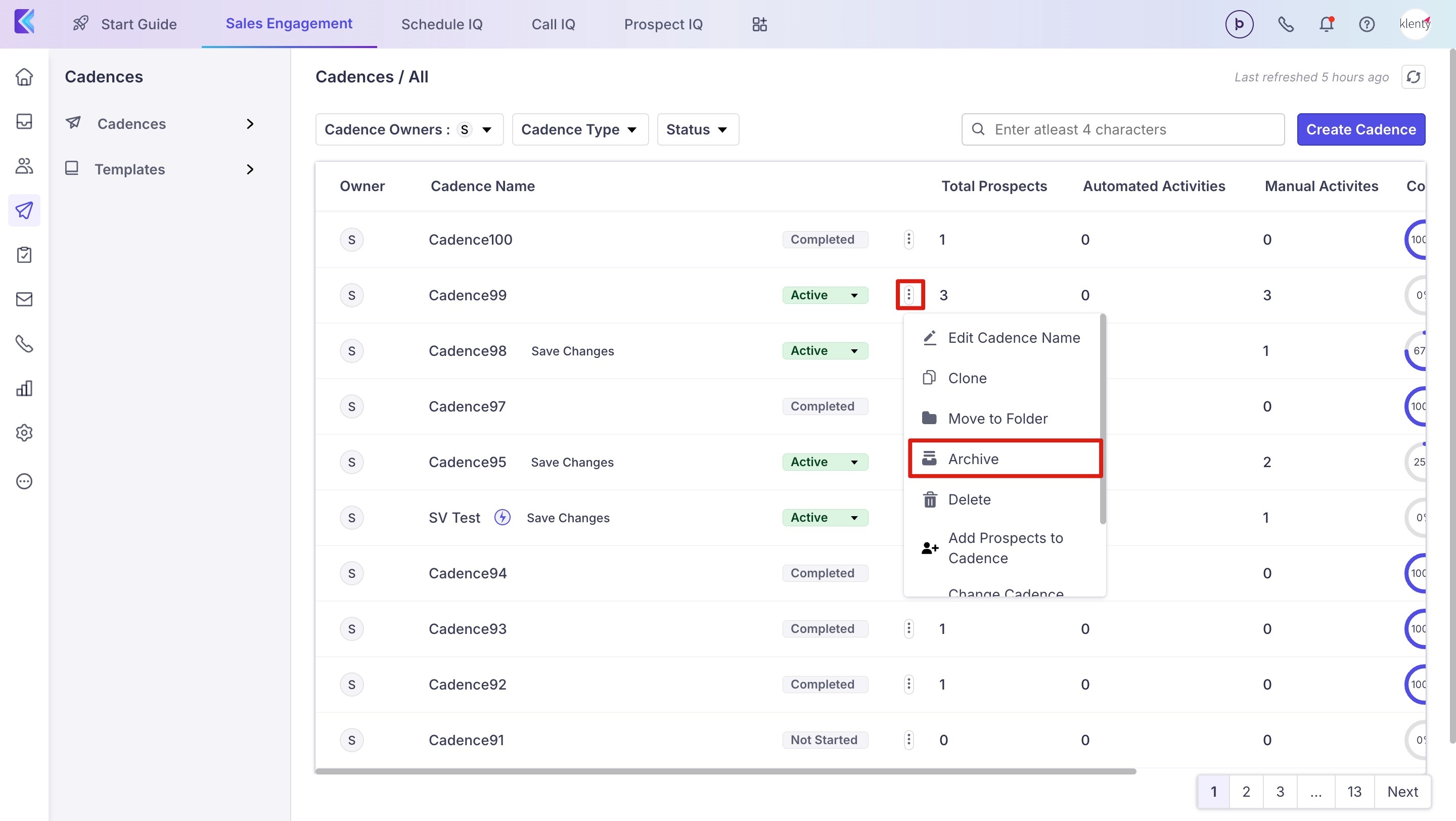 Click on the three dots to the right of the cadence you wish to archive and select the Archive option