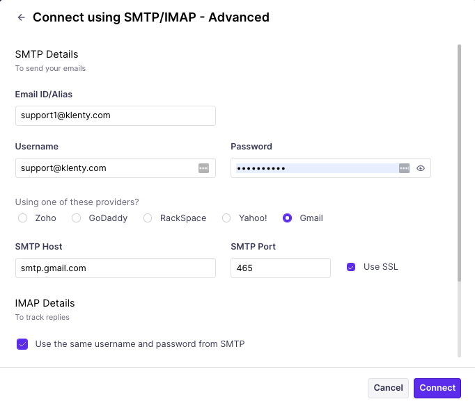 In your Klenty account, go to Settings > Email Settings > Email account > Add an email account > select 'other SMTP/IMAP' in the connect email pop up box > choose 'Advanced settings'