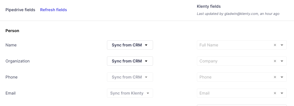 The standard fields (Name, Organization, Phone, and Email) will be automatically mapped, and you will not be able to make changes to them. Map any custom fields you’d like to add to the prospects while importing to Klenty. You can map prospect fields under Person, Deal, and Organization from Pipedrive to Klenty.