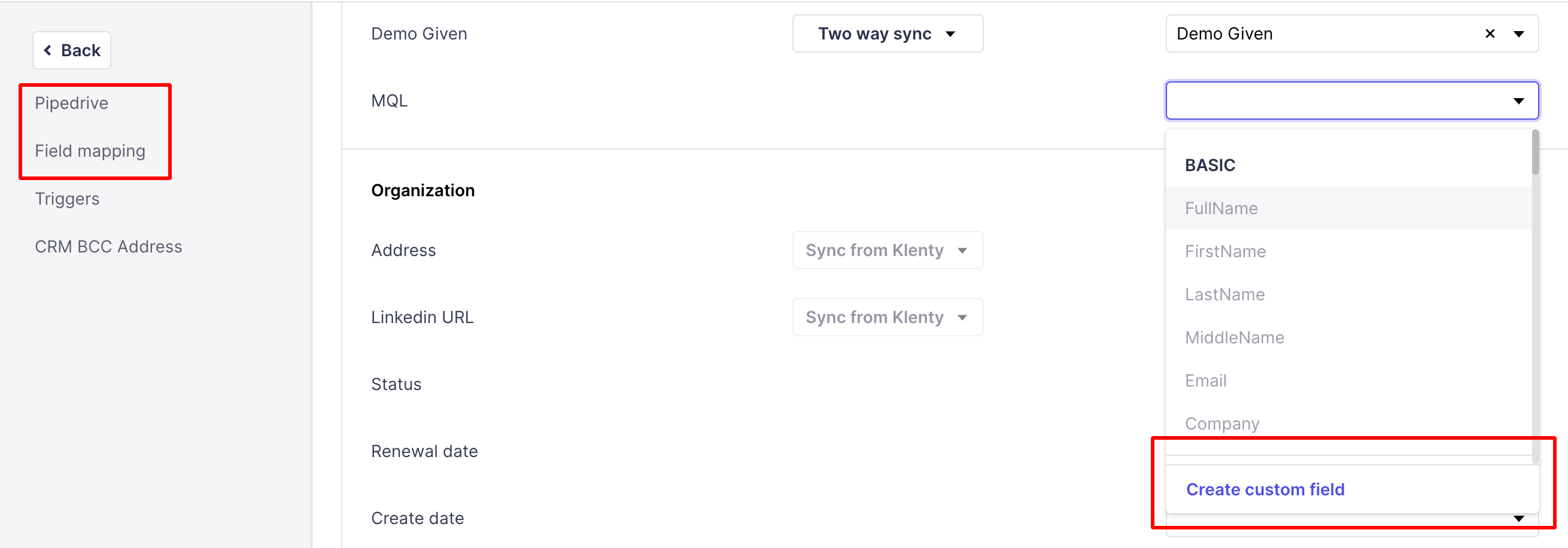 To achieve this, create a custom field in Pipedrive, allowing for mapping between fields. Once created, navigate to Main settings--> CRM integrations--> Field mappings.