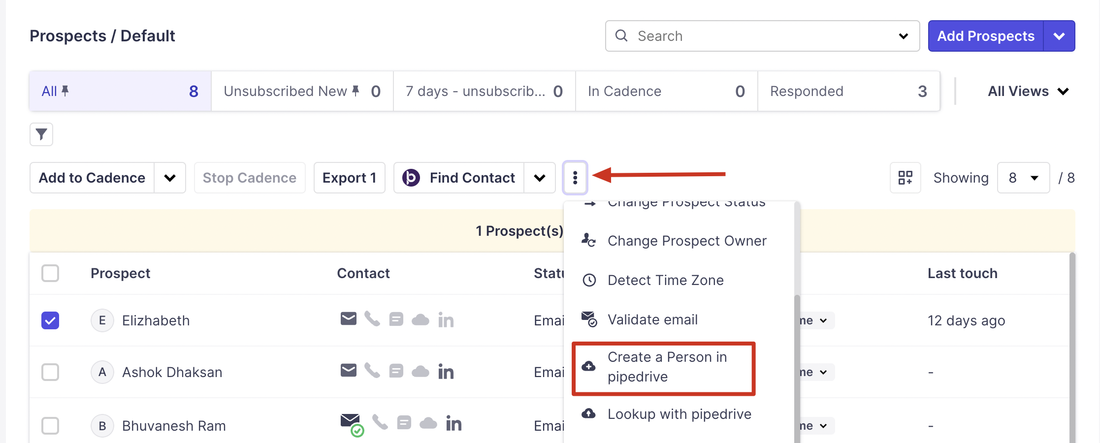 You can also select more than 1 prospect (max 100) and export them to Pipedrive.