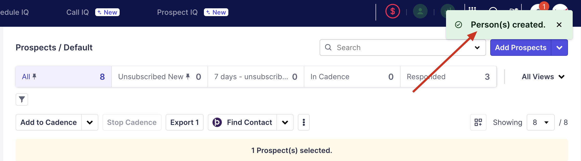The sync with CRM(cloud) icon will turn blue when hovered, indicating that the prospects have been exported.