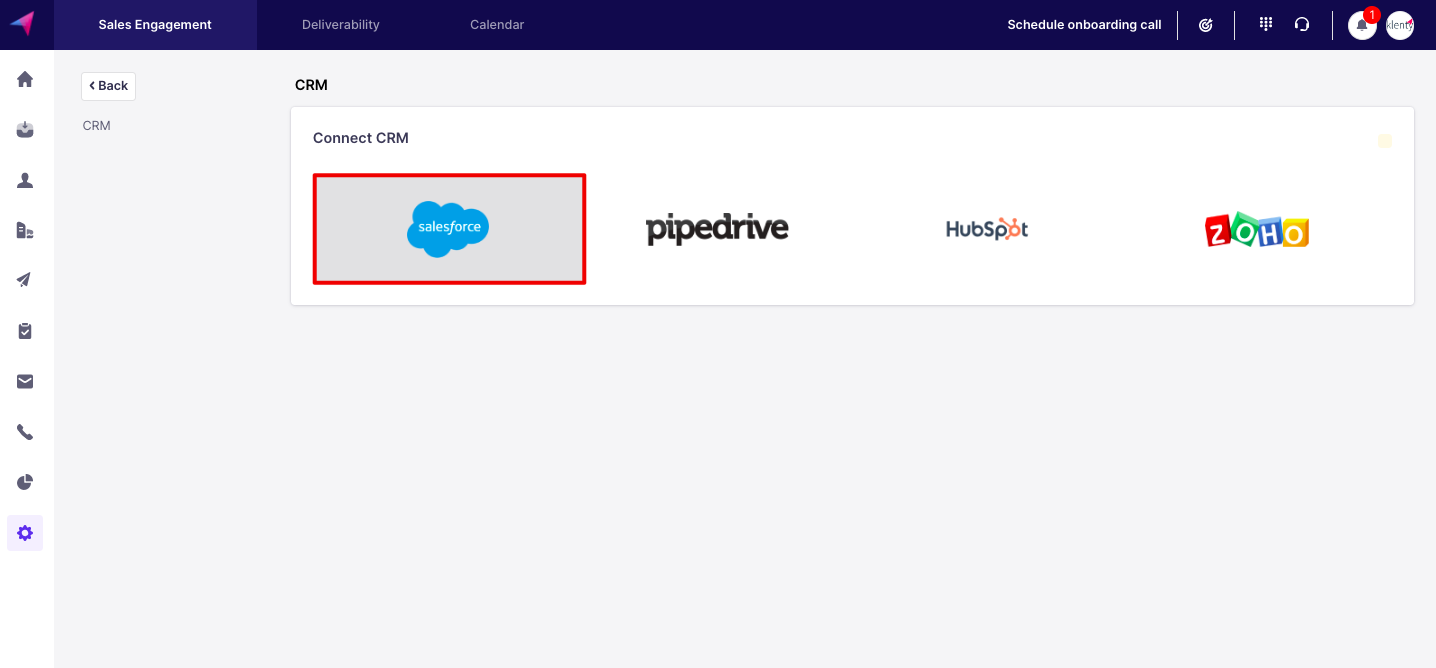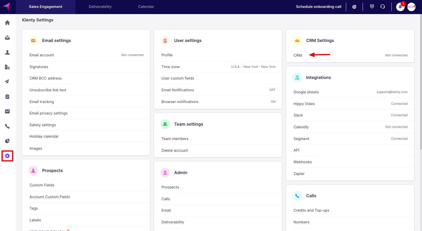 Login to your Klenty account and navigate to Settings -> CRM Settings -> CRM.