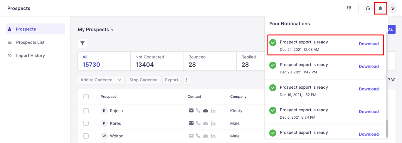 5. The exported data will be sent as an email to the email address specified for email notification. You can also check out a copy of the same .csv file from the notification icon.