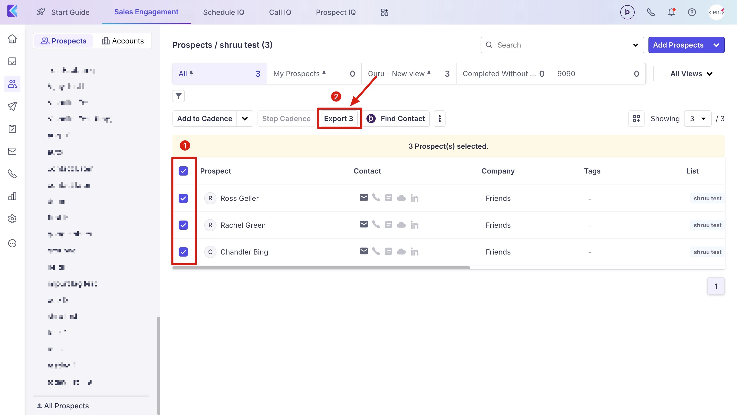 Go to the Prospects page, select the prospects you wish to export, or use the Prospect Filter to select a specific set of prospects.