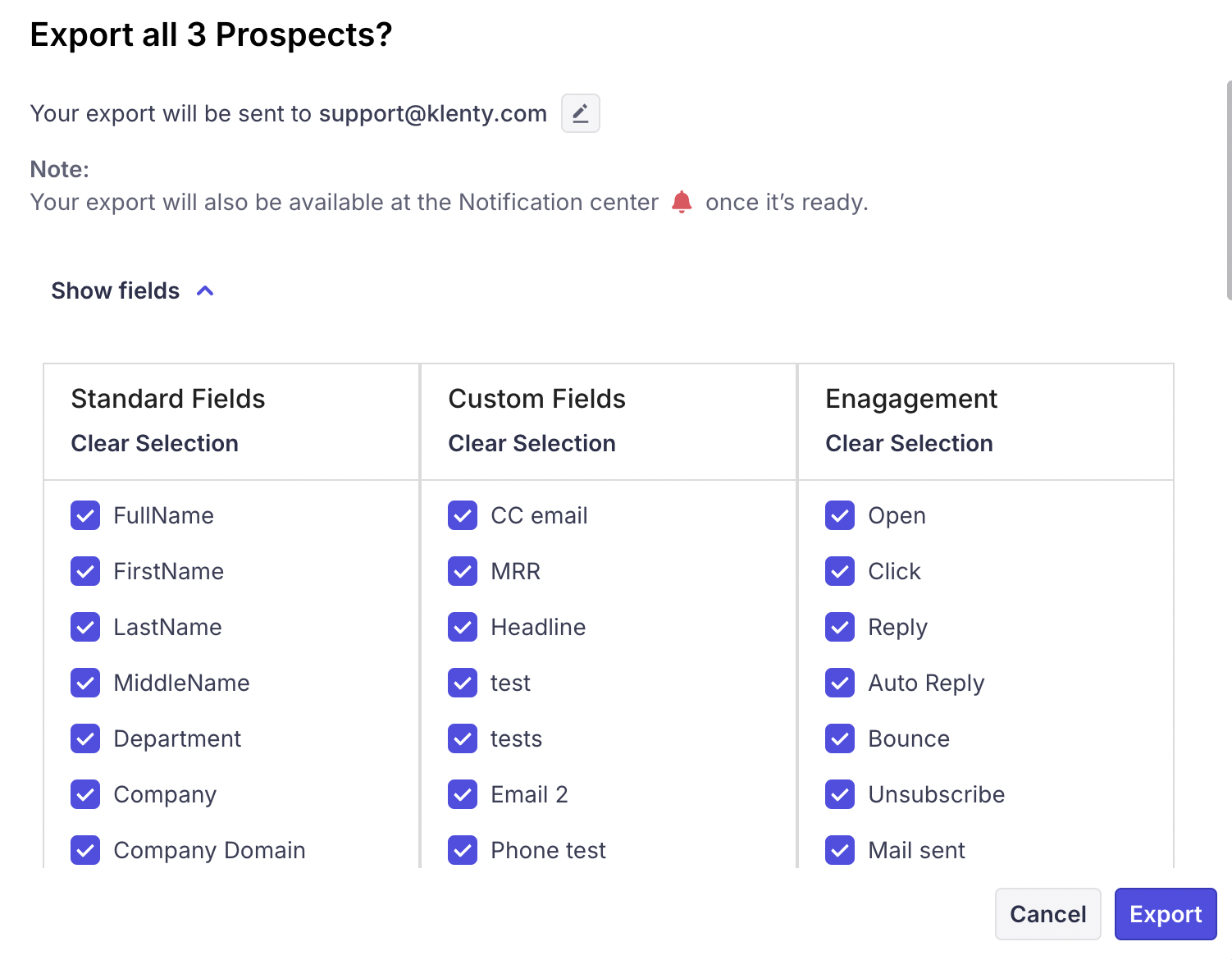 Select the fields you want to export, along with the engagements (like opens, clicks, and replies), and click on Export