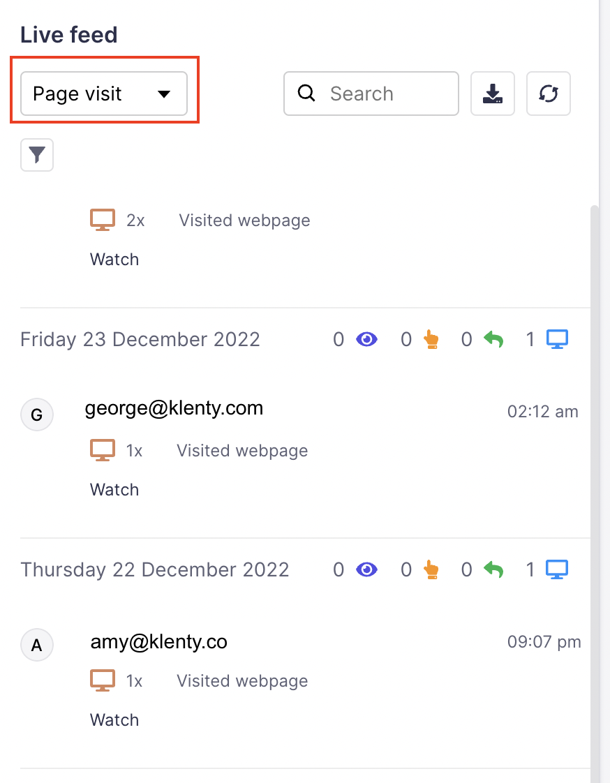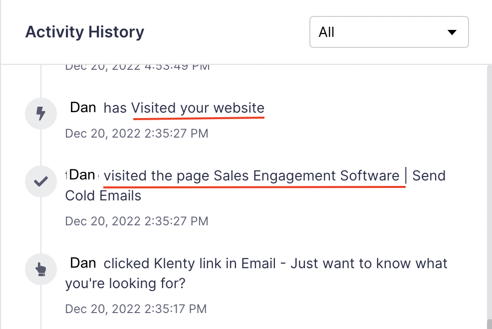 This allows you to track prospects that visit your web pages such as the title and the URL of the page. You can set up slack notifications for these website visits. You can also click on a prospect to view the detailed prospect engagement history – which now includes website visits and in the Live feed page.