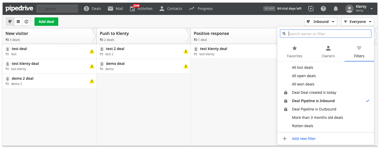 Step 1: Create a filter in Pipedrive where all the new contacts/deals will be added.