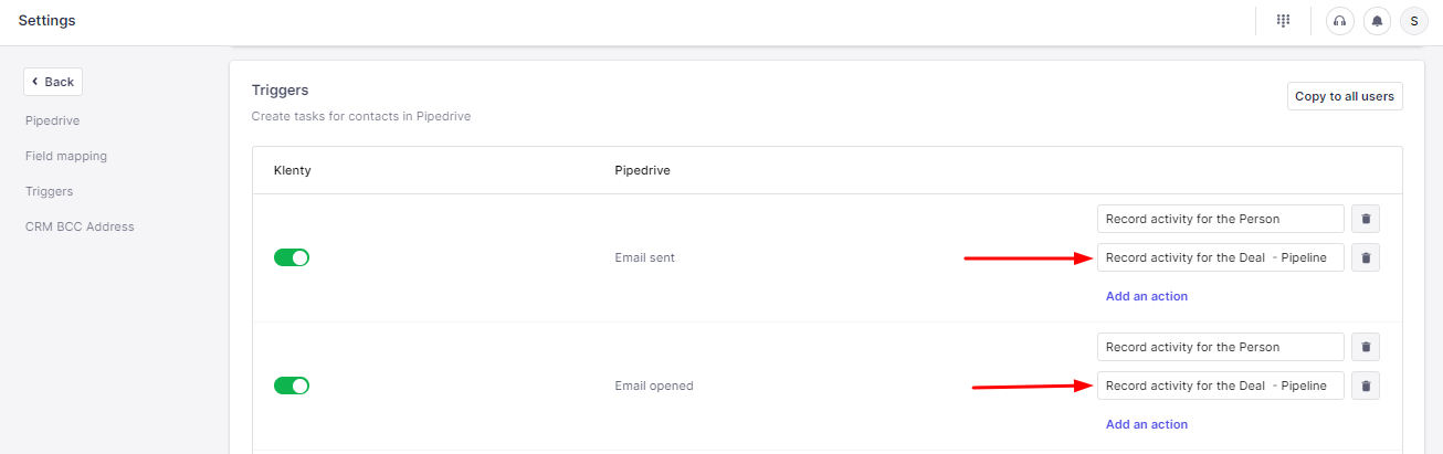 Step 4: Set up triggers in Klenty to sync email engagement data back to Pipedrive - like emails sent, opened, and create tasks in Pipedrive to always have updated information on your leads.