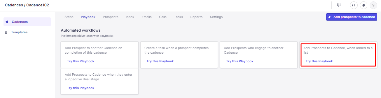 Step 3: Link the imported prospect list to a Cadence and setup up a playbook so that every time a prospect is added to the list they get started in the cadence