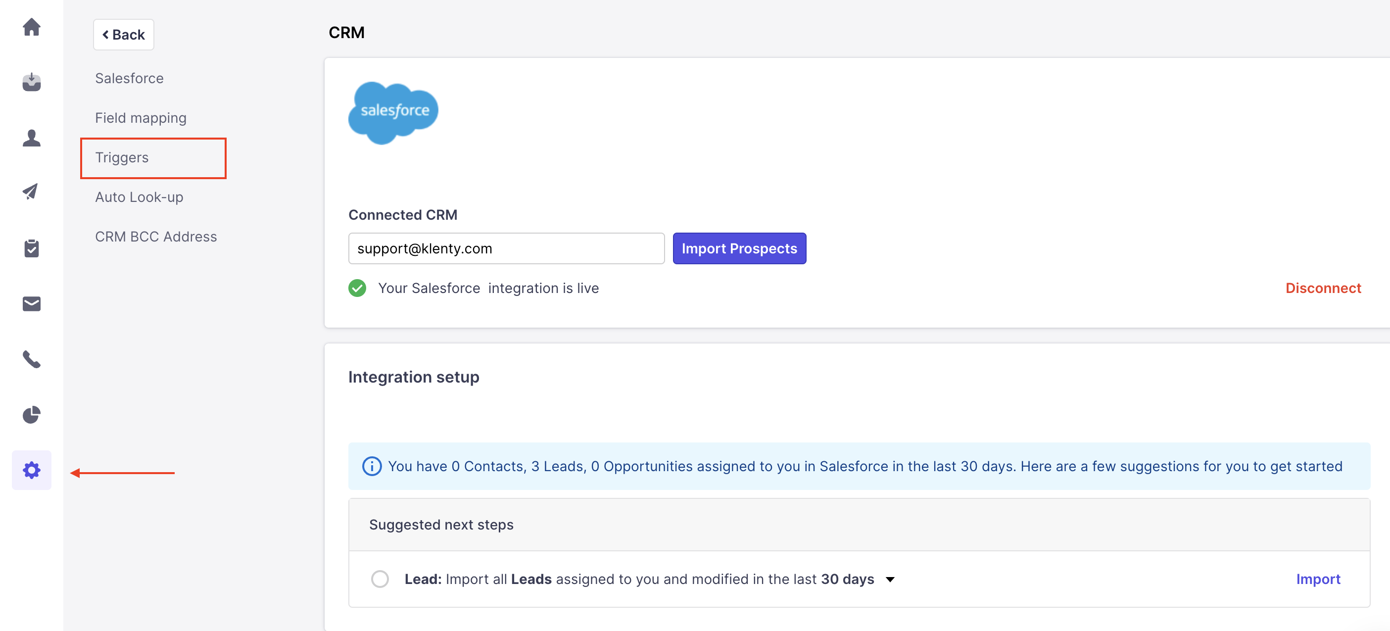After connecting your Salesforce account to Klenty, Go to Settings -> CRM Settings -> Salesforce