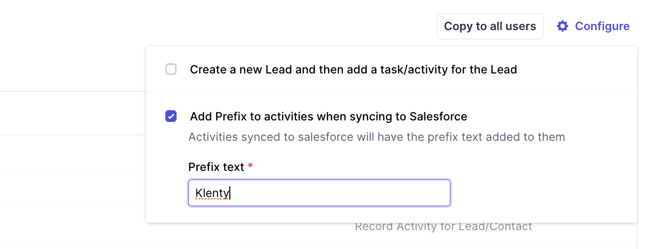 The above triggers will create activities in your CRM with a common prefix as Email Sent, Email Open, etc. However, if you would like to differentiate the activities created by Klenty and other platforms within your CRM, you can choose to add a Prefix