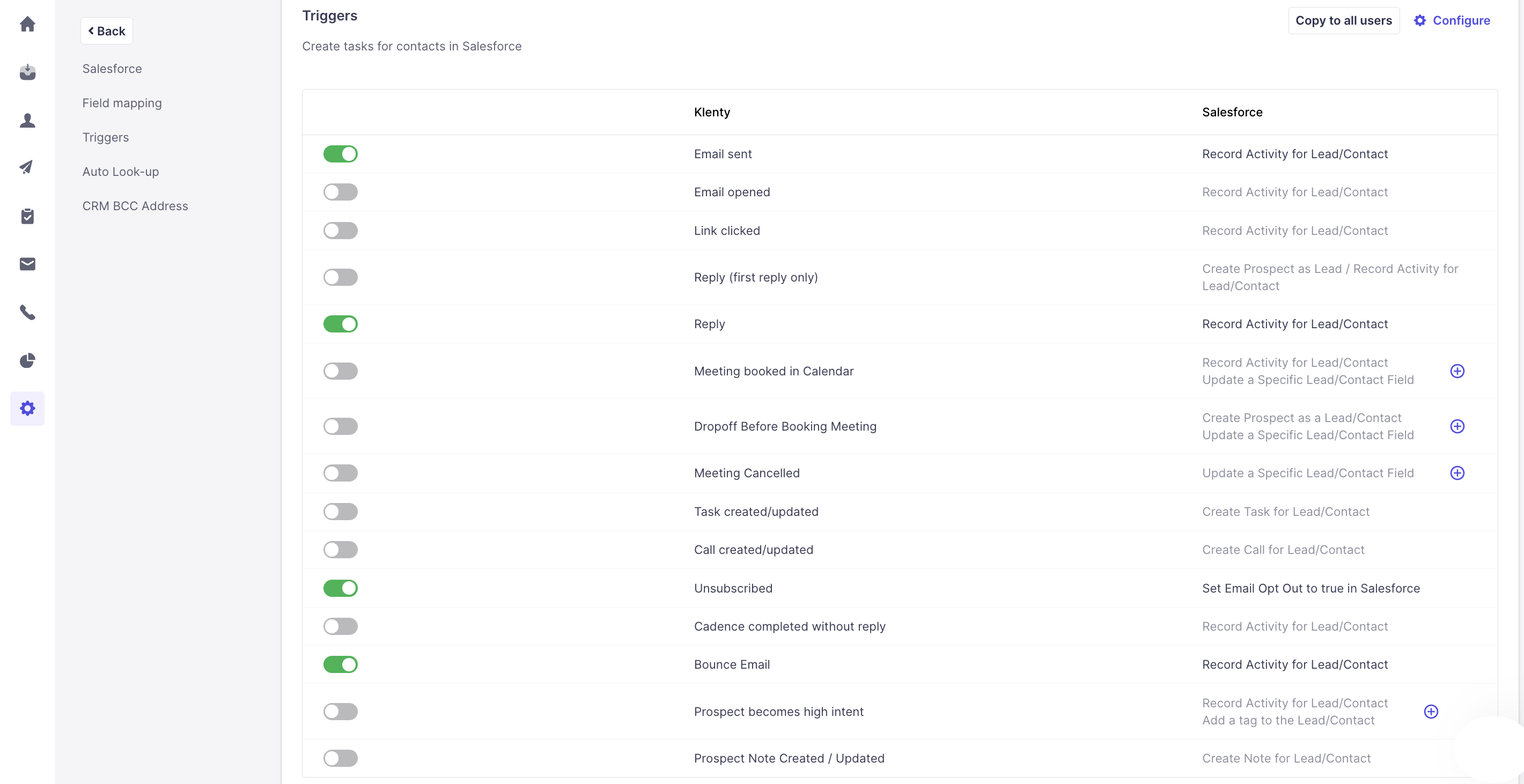 Klenty simplifies Salesforce activity logging by automating the process through predefined triggers. Also allows you to create Leads in Salesforce automatically.