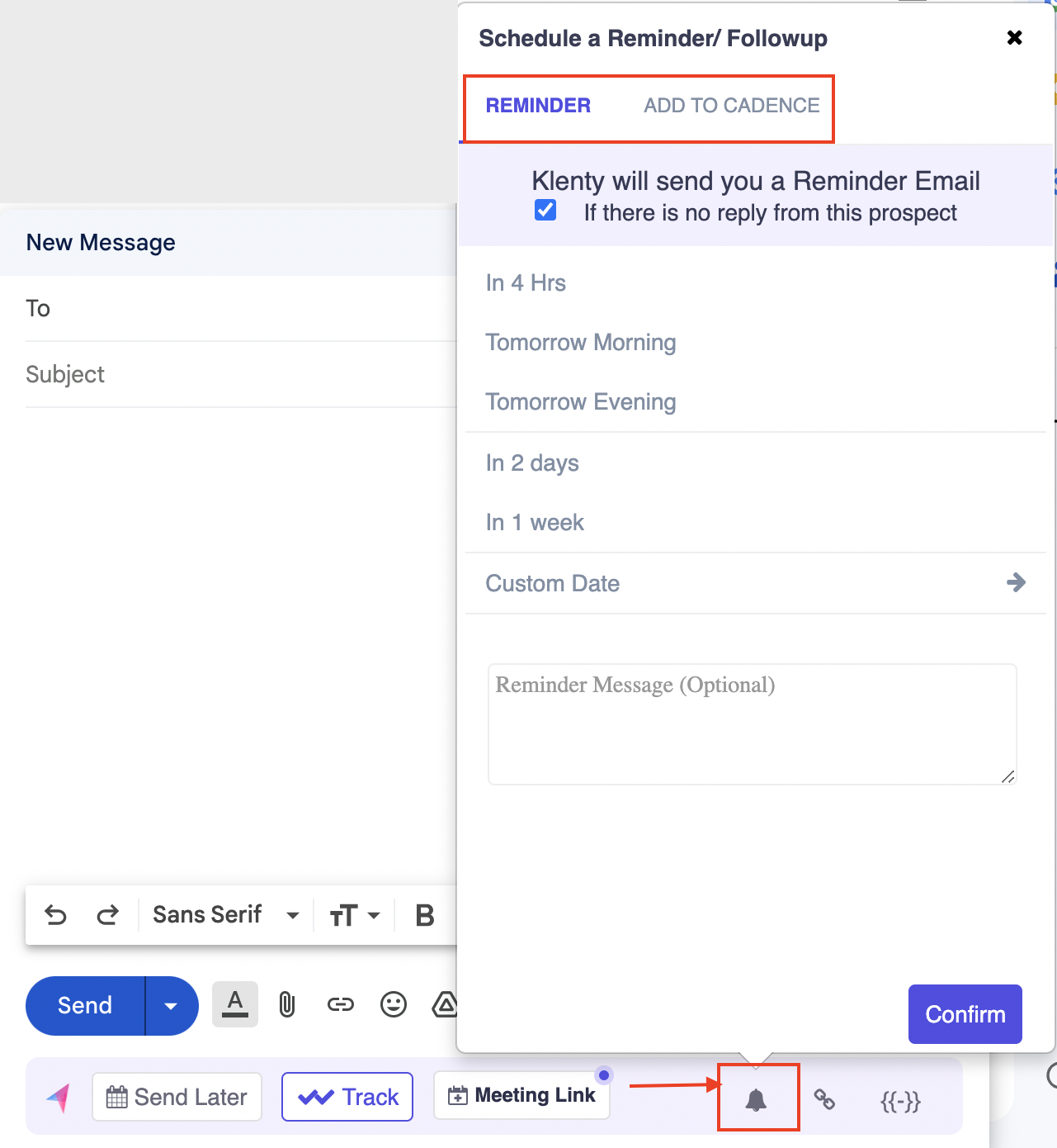 Click on the Reminders/Cadences icon to send yourself a reminder email after the set time. You will receive an email in Gmail