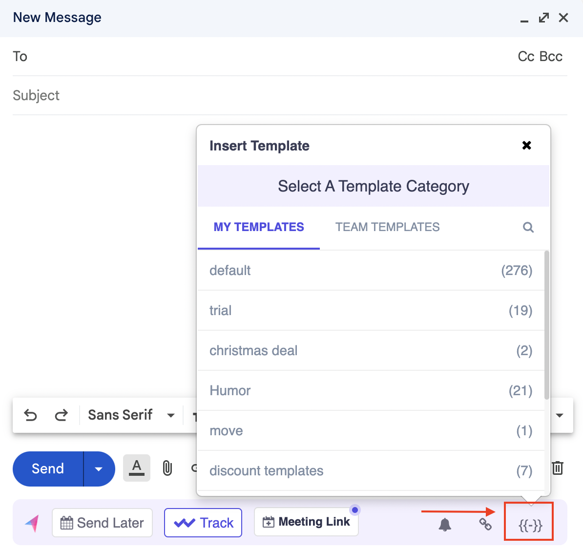 Click on the Templates icon to insert a template that you have created and saved in Klenty.