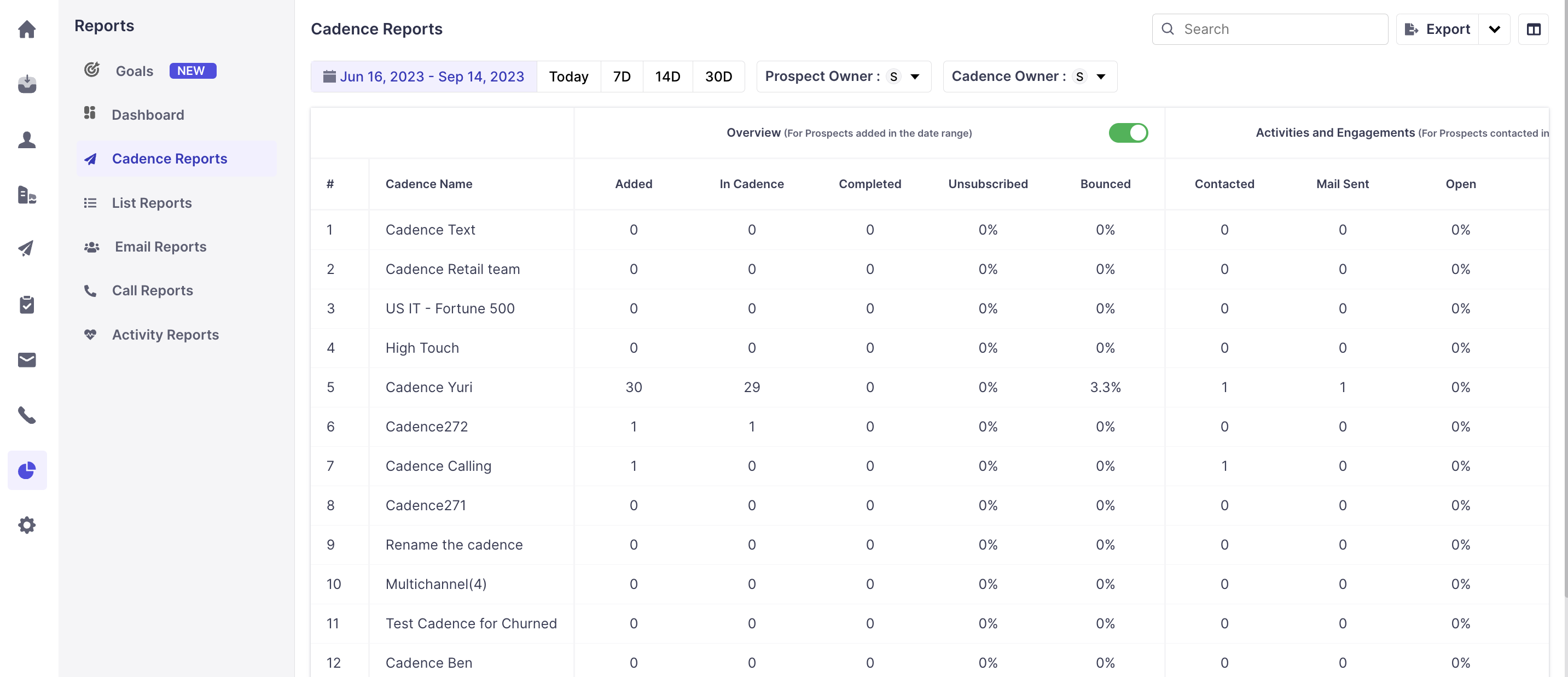 Go to Reports – Cadence Reports to view the following statistics for each cadence.