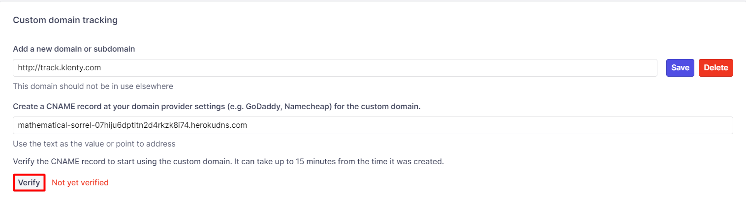 Once you've added the CNAME record, give it about 15 minutes. Then head back to Klenty Settings and hit Verify. You may see an error message; that means it's taking longer than expected. We'll stay on it until we're able to verify the subdomain. You've done your part.
