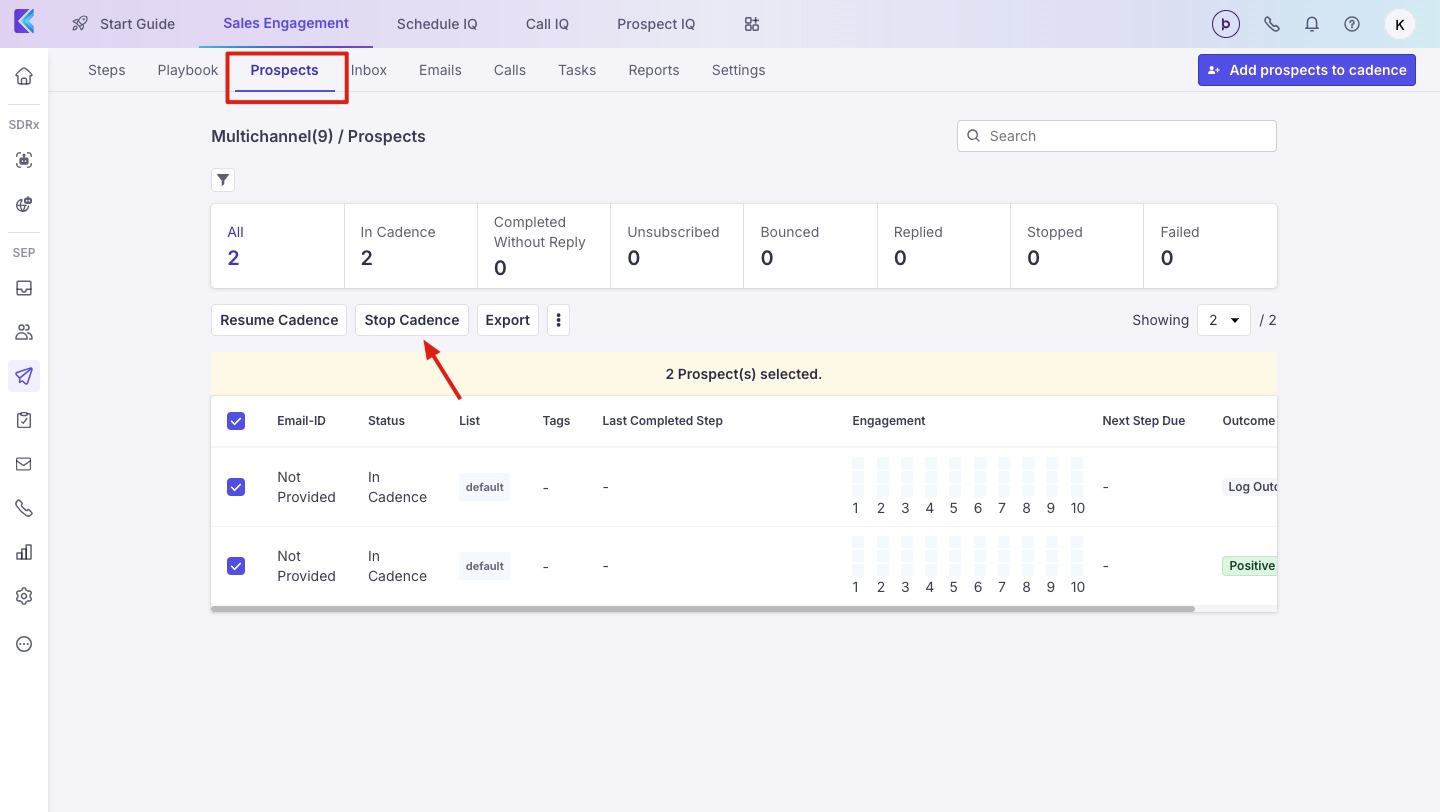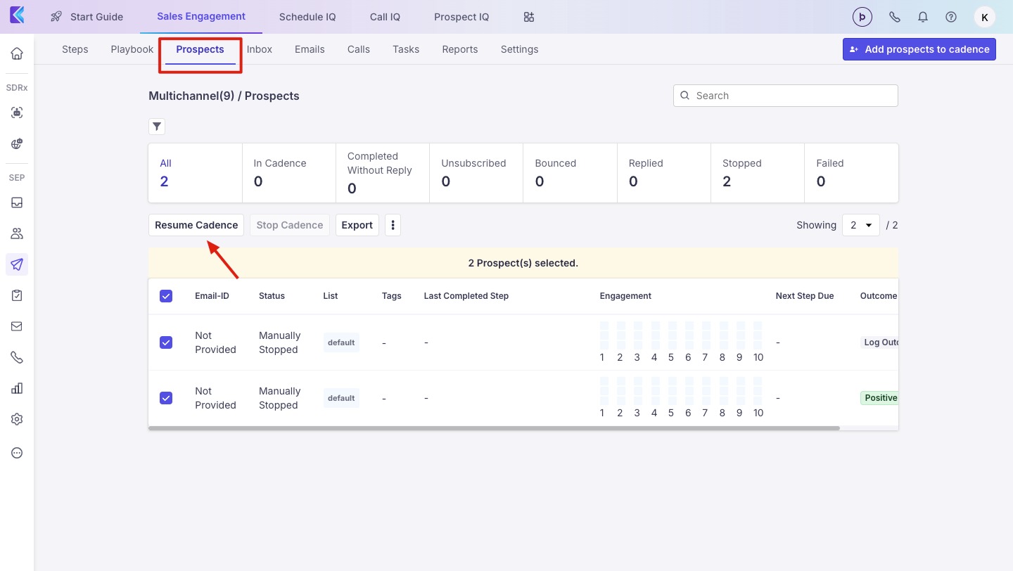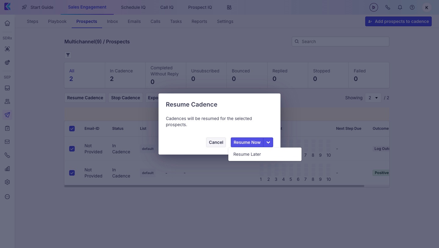 Select the prospects you wish to continue the cadence for and click on Resume Cadence.