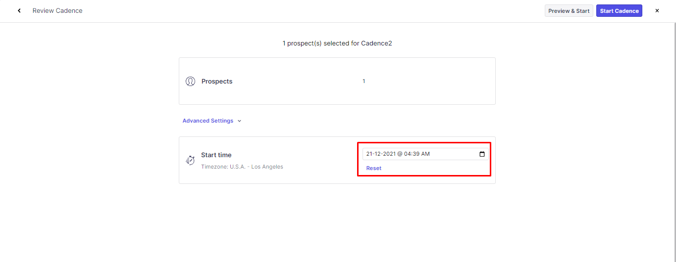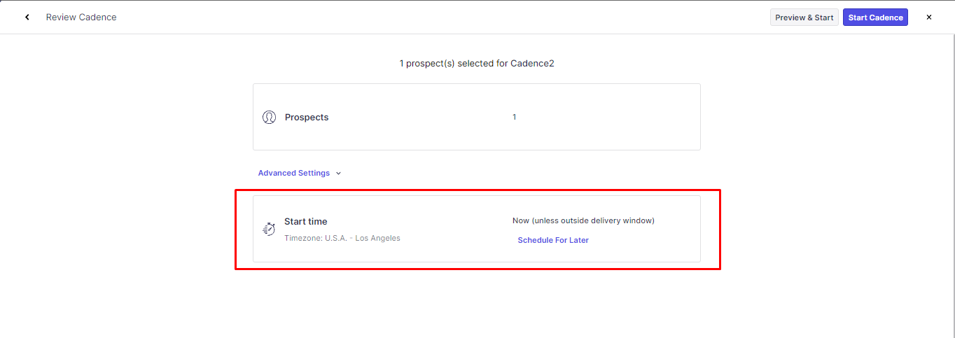 When adding prospects to a cadence, you can select a specific time that the emails should start sending.