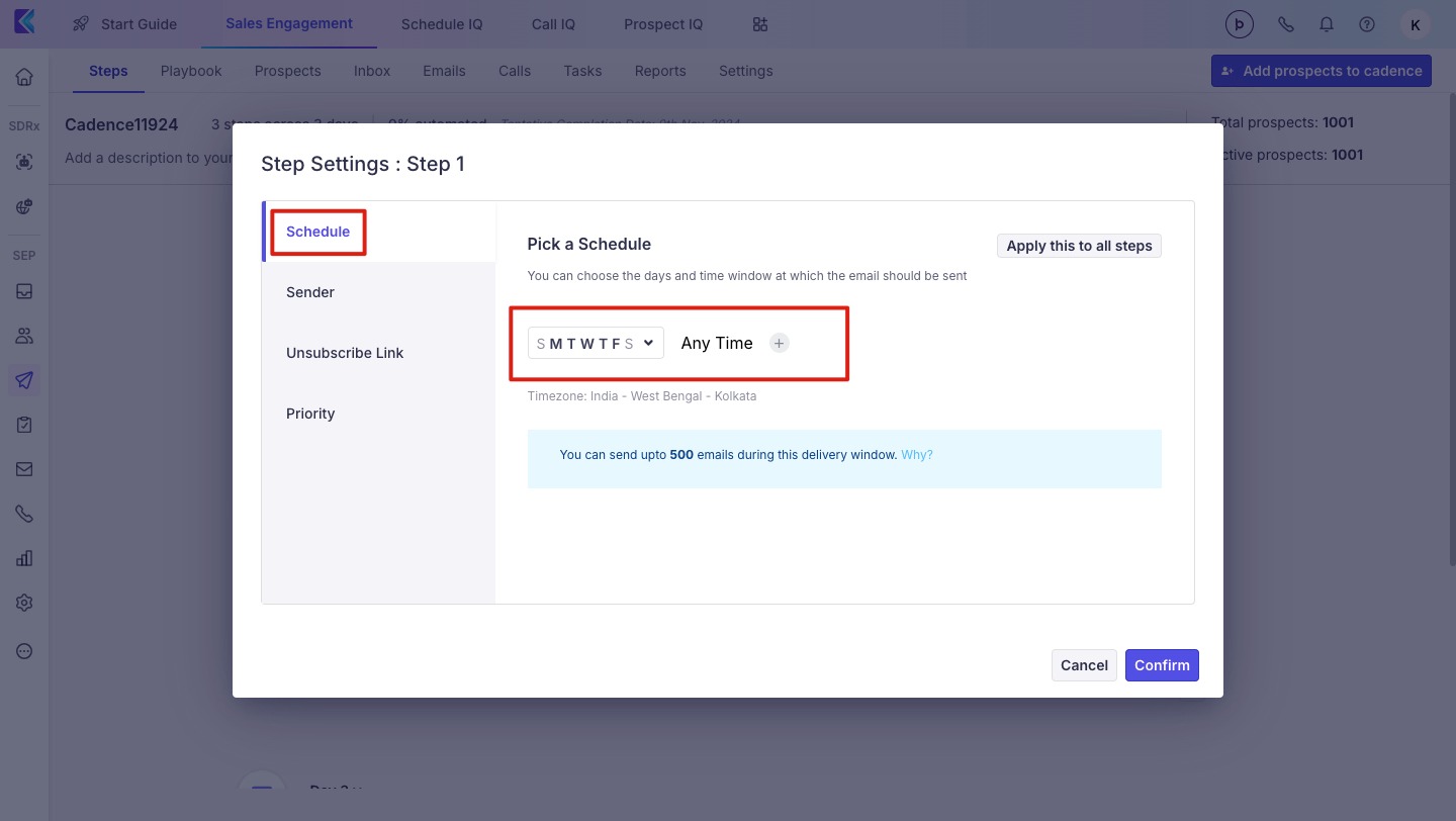 When you use the delivery window and schedule days, Klenty will only send the Cadence emails during the days and hours you have set. At the end of the delivery window, we will reschedule any remaining emails to the start of the next delivery window.