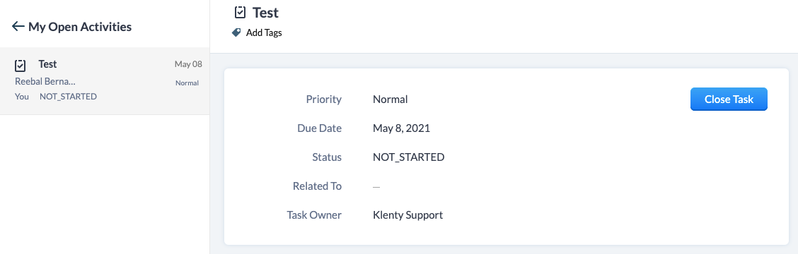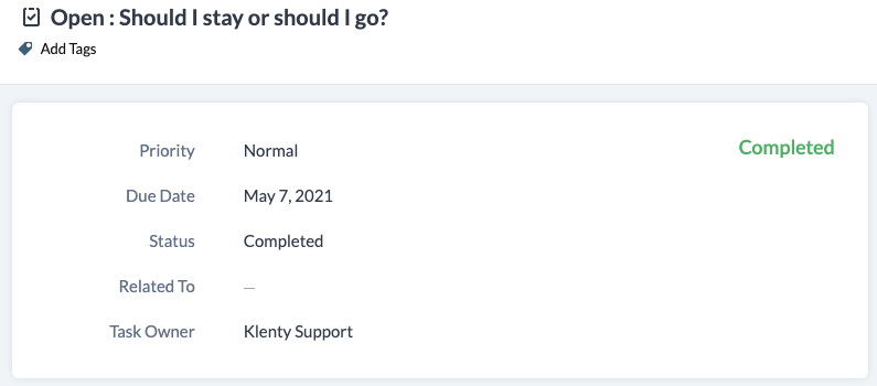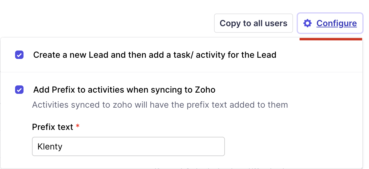 As far as " tasks and calls " triggers are concerned it will be created as an open activity, which can be completed either from Klenty or from Zoho. Others will be created as closed activities by default and can not be customized.