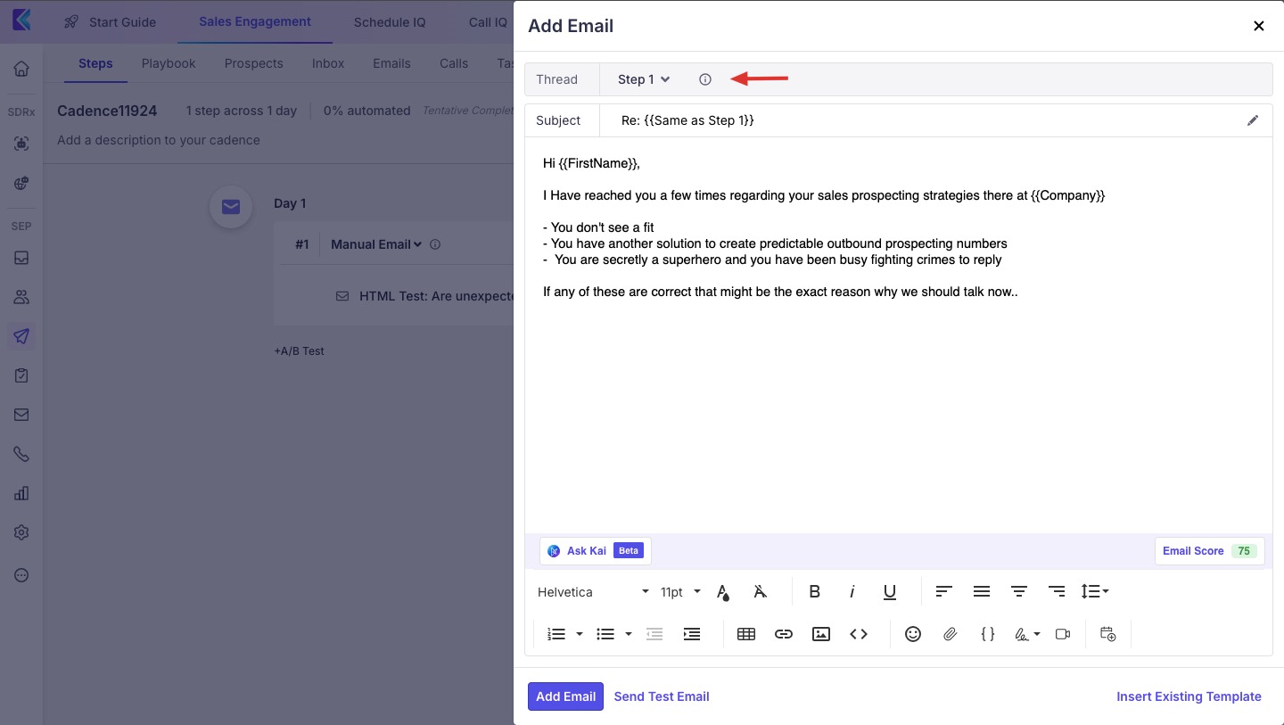 Include the Email thread while drafting the follow-up email and select the step to be threaded here.