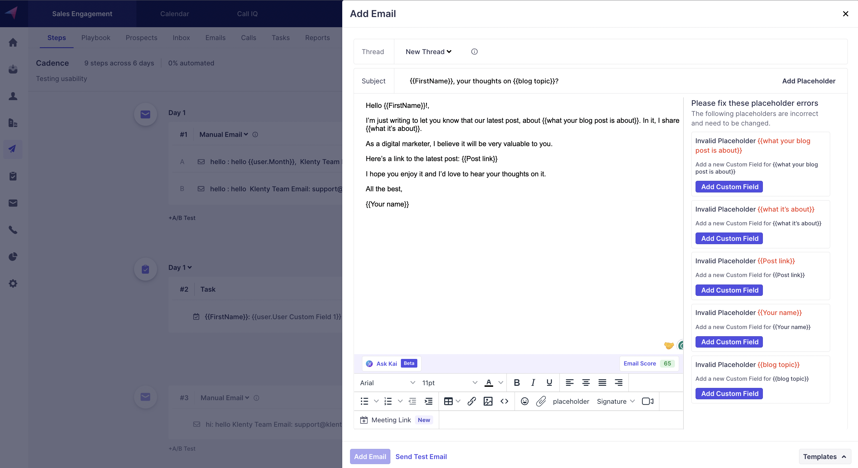 Klenty validates the placeholders you have used in your template to avoid any errors when adding emails to your Cadence. If you haven't mapped a particular placeholder to a field, fix it by adding a custom field without leaving the screen,