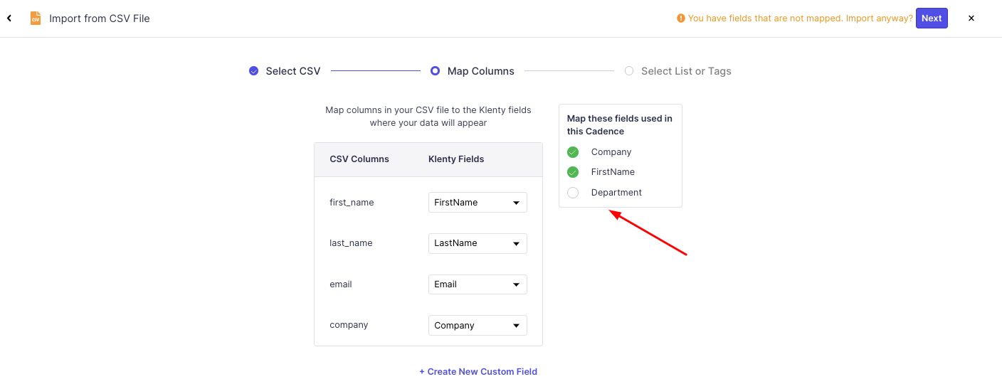 For example - if you used the field 'Department' in your emails but you had not mapped it in Klenty yet, the field will appear 'unchecked' in the list of fields used in your Cadence. Once you map it, the checkbox will turn green - indicating that you are good to go!