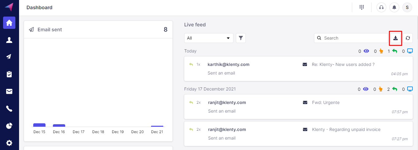 Home > Livefeed (to get an export of all email engagements):