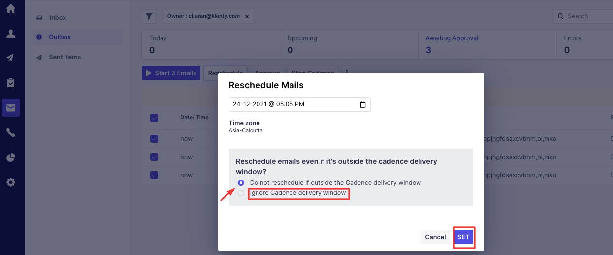 Ignore the cadence delivery window - Emails will be scheduled even if the current time is outside the delivery window.