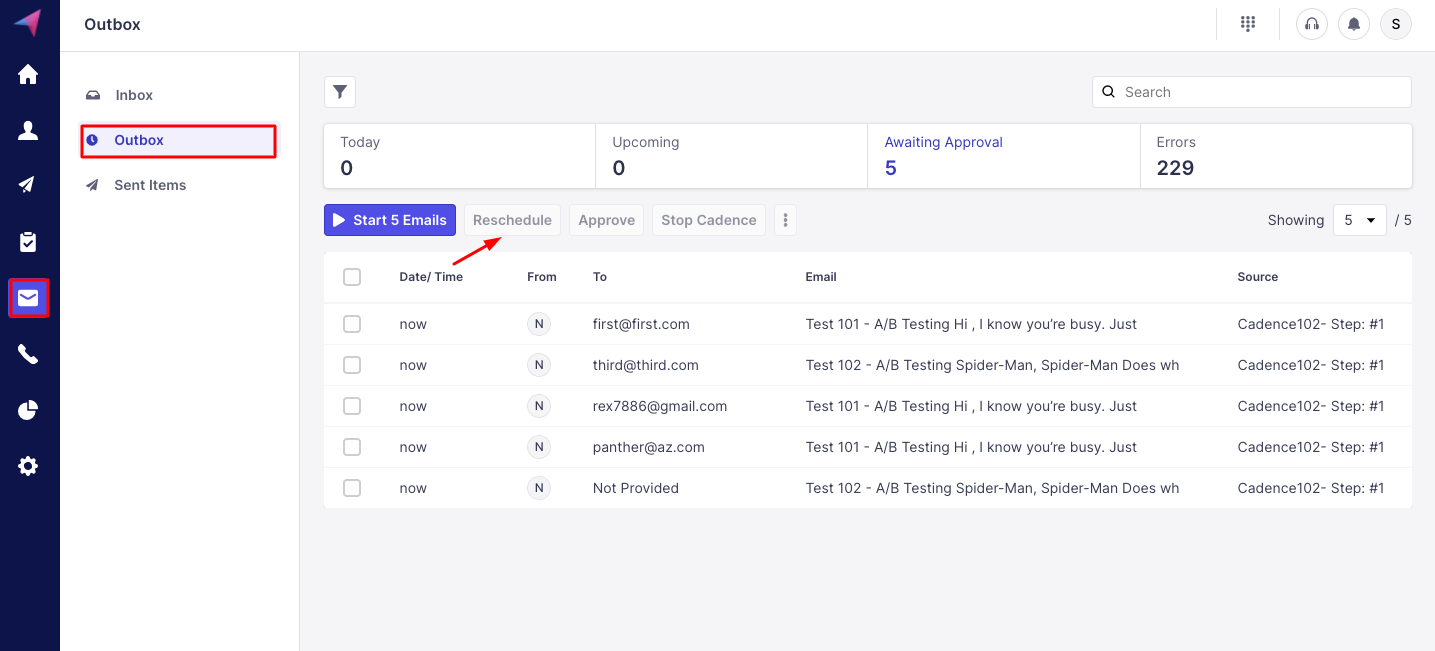 Select the emails you want to reschedule, and click on Reschedule.