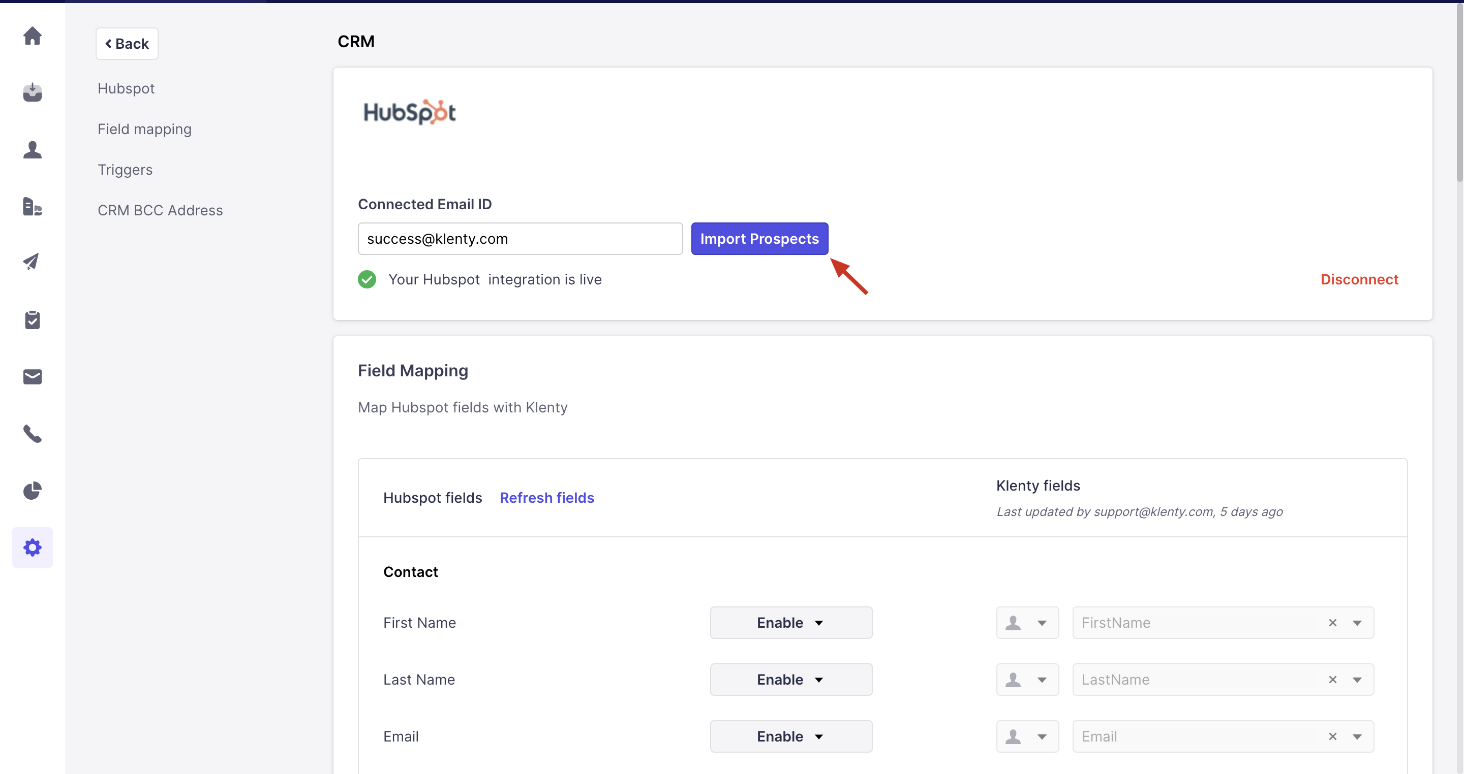 Head to Settings > CRM Settings > Hubspot