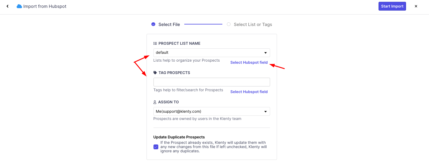 8. Finally, click on Start Import on the top right. You'll see a Success message of the prospects imported.