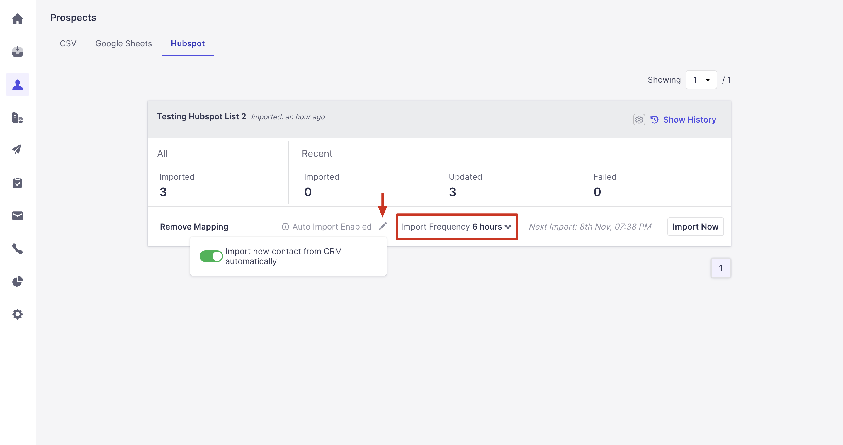 Import Now: use this option to import any new leads/contacts from that filtered view. You can use this option when you don't have auto-import enabled, or when you need to immediately import prospects and cannot wait for the auto-import to run.